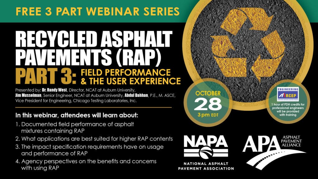 Asphalt pavements are the most recycled material in the U.S., primarily because asphalt mixes that contain RAP have good performance histories. This part of the webinar will highlight studies on field performance conducted by numerous state DOTs, the Federal Highway Administration, and various pavement research organizations including the National Center for Asphalt Technology. The segment will also highlight the experiences of two pavement engineer veterans who will provide long-term perspectives of using RAP in asphalt mixtures from the Illinois DOT and the Florida DOT.